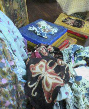 これは、コラージュをしているところです。インド綿がほとんでですが、自然素材のプリント地を適当に画面に貼り付けてゆきます。まぁいいかげんといえばいいかげんなんです。何が出てくるのか、何描くのかも決めていない。この後水性の絵の具をたらし込んでほとんどプリント模様は見えなくなってしむのですが、どこかでちらちらと見えるのが何かしらのイメージを呼ぶわけです。