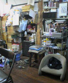 といいながら、わがアトリエを眺めると確かに雑木林の混沌のようだ。狭いものだから物は段々と上に重ねあげられて、一つの壁になっている。奥にあるダンボール箱にはボロ布が色に分けて入っている。これはボロ布というのか、絵の具というのか私にとって画材ではある。この雑然とした混沌にもそれなりのルールがある。ただ単に無秩序に物が置かれているわけではない。「無意識」ではない。ここのところが微妙だな。