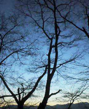 真中少し上の梢の間から宵の明星がきらきらと輝いていた。けれど写メでは今ひとつきれいに撮れていない。残念だけれど自分で眺めてみてくれ。日没後すぐ西の空にさん然と輝く星が明星だよ。