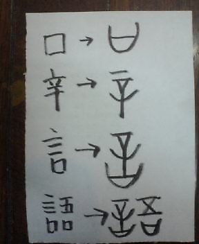 「言」というのはその「サイ」の上に「辛」を乗せた形。「辛」というのは大きな針で刺青の道具。で「言」というのは自己弁明、神かけて誓うというようなことだったらしい。嘘偽りがない証しに間違っていれば自らの身体に罰として墨をいれる覚悟だというようなことか。