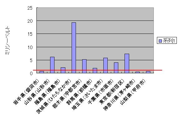 これ以外の地方は上記の値よりかなり少なめでした。こうやって比べて見ると福島市より茨城県のひたちなか市の値が異常に大きいということが分る。東京はすでにかなりの放射線を浴びていることになる。