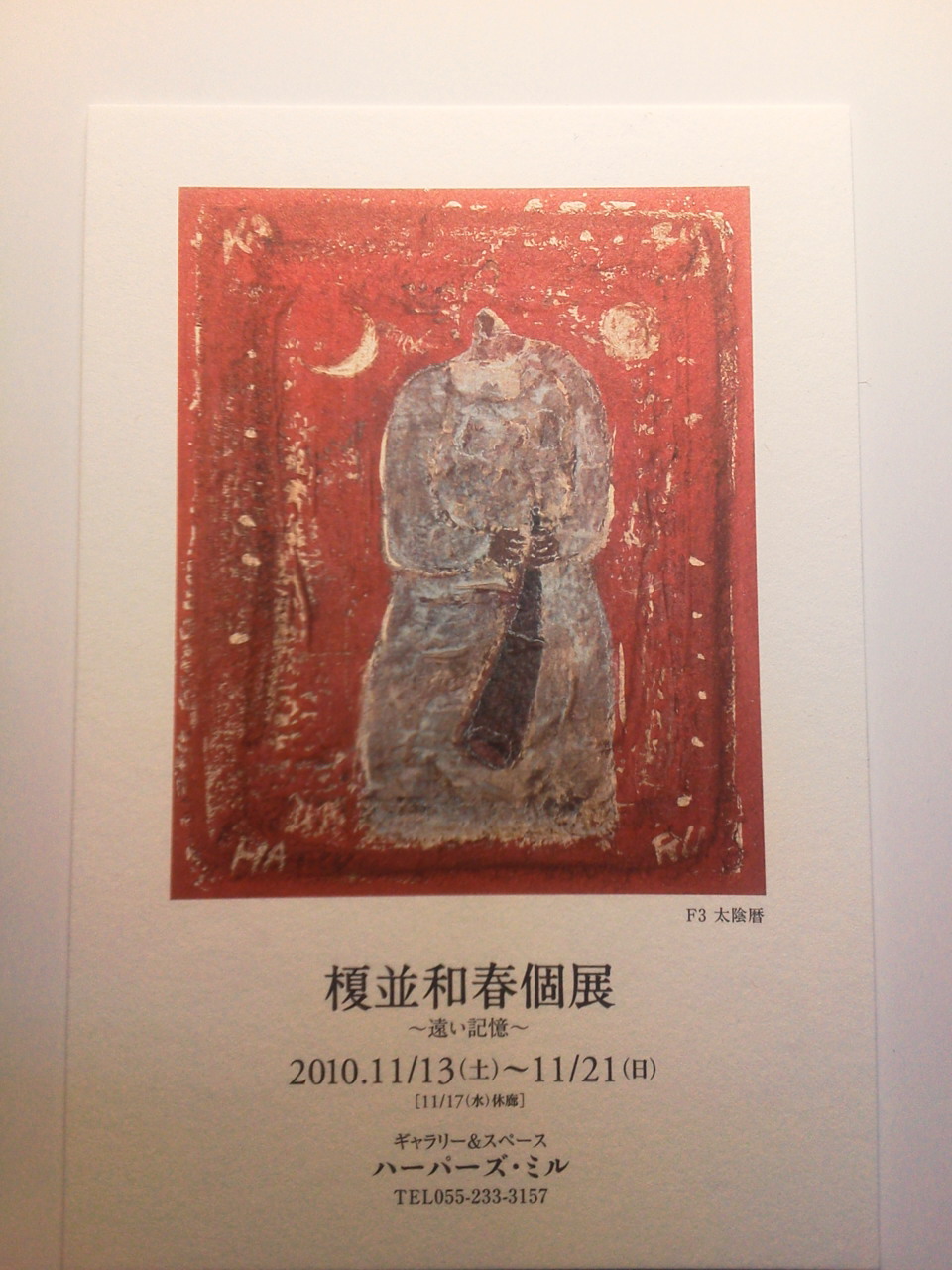 甲府の個展のDMが出来ました。一度個展にこられた方は展覧会一週間前(11月)になりましたら送るつもりです。いま少しお待ちください。それから遠方の方で是非DMが欲しいというひとはここに住所、氏名を書いて送って下さい。