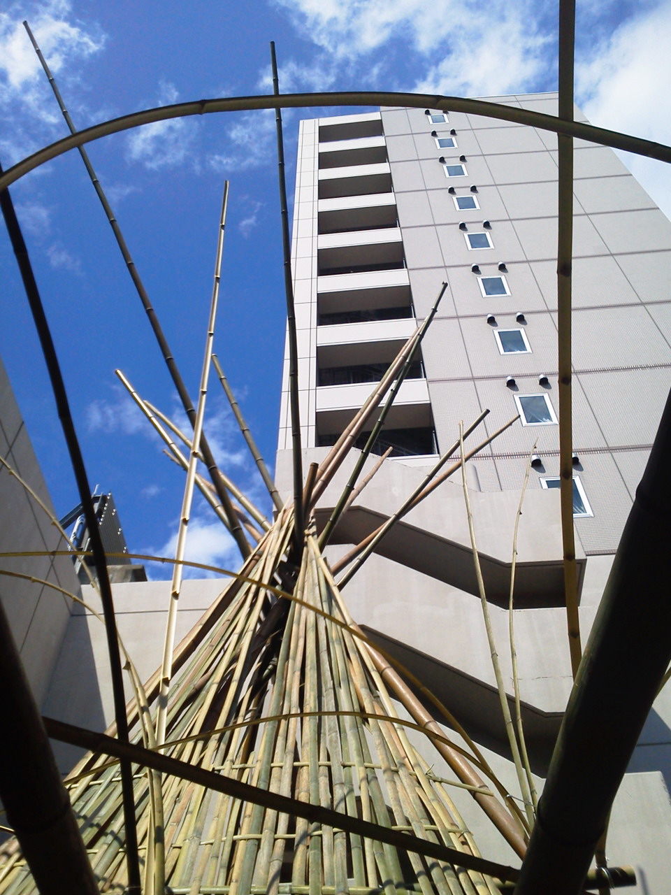 一番上は福嶋孝一氏の竹のオブジェ。銀座通りはもうすでに死んでしまった商店街です。昼間歩いてみてもとてもこれが甲府の中心街の銀座商店街とは思えません。そんな中に、われ関せずどっどと天を突き刺すように竹が伸びているのは非常に気持ちがよかった。今回の出展の中でも出色の作品ではないでしょうか。相当な人物とみた。