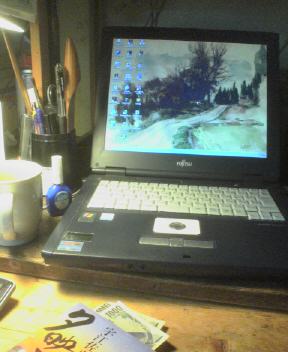 これが私のホームグラウンド。本当に小さなノート型のパソコンがあるだけ。これだけで一応世界中と交信できるし、自分のブログが日々発信できるのだ。考えてみると本当に不思議なものだ。