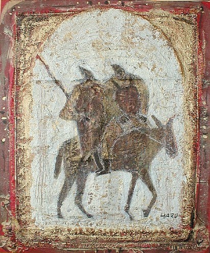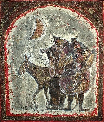 今年の団体展の作品のタイトルは「祝人」で普通は(いわいびと)と読む。でもそこにはある意味が隠されていて昔は(ほきひと)と読んだらしい。ほきひと→ほひと→ほいととなる。「ほいと」とは辞書でひけば乞食だな。ようするありがたい祝詞(のりと)を唱えて少しばかりのお布施をもらって流して生きている乞食芸人のことなんだな。