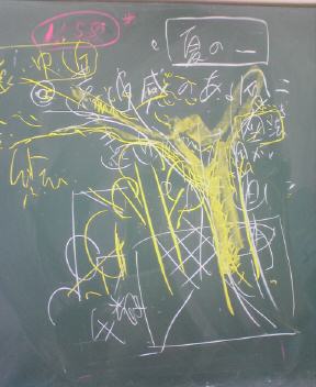 モチベーションをあげるために御まじないをかける。これだけを知っていれば絵が描けると力説。(そんな即席の方法はないのだが・・)生徒をその気にさせる。豚もおだてりゃ樹に登る。そんな時黒板に描いた絵が↑の絵。そんな気になったかな?