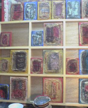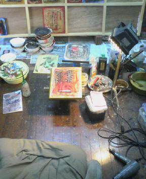 現在、画材はアクリル絵の具や土、木、布などで「画材店より建材屋にいく方が多い」という日常。はけやこてを使うことも少なくない。