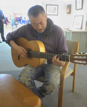 昨日は野暮用で東京にでる。そのついでに三箇所ほど個展会場を覗いた。一つは来年早々にお世話になる銀座松屋デパートの画廊。私と同じキュレータ(企画屋さん)の企画で、盛岡在住の版画家兼ギタリストである大場冨生の個展をやっていた。作家が在廊されていてリクエストしたら気軽に応じて「黒いオルフェ」を演奏してしてくれた。感激!いずれまたどこかでお会いしましょうと約束して次の会場へ。