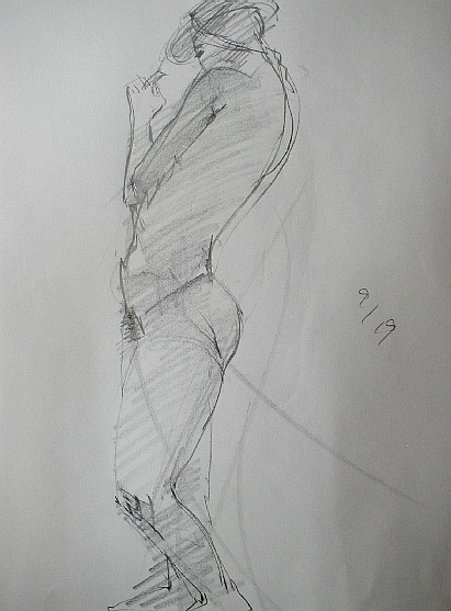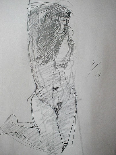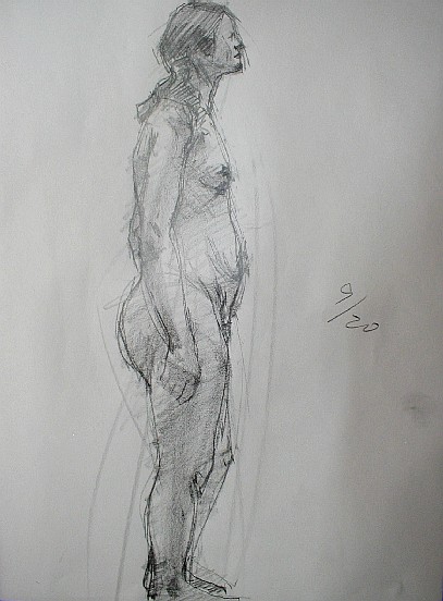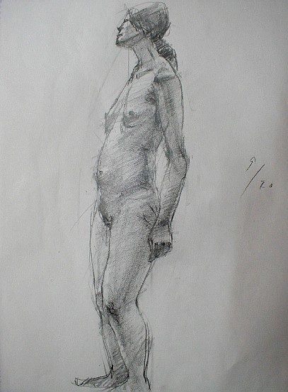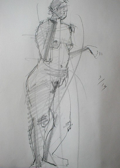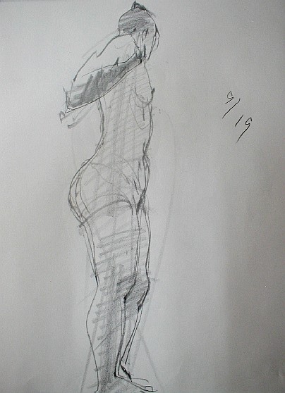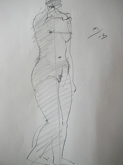 モデルを見てただ漫然と筆を走らせているだけでは絵はかけるけれど、絵にはならない。絵にしようとすればそこに自分の「意識」をこめなければならない。そこが表現というわけだ。絵を描くという行為はどういうことかというと「私はこう見ました、見えました」ということを報告している訳で、もう少し具体的に言えば、左足に体重がかかっていますよ、とか下から見上げているから上半身は縮まって見えますよとか、胸の左右の位置は右が少し上だよとか、そういうことを無意識のうちに意識しなければならない。そう意識するだけで絵はかなり違ってくる。