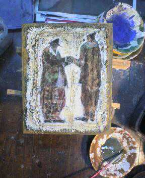 アトリエに立てられていた制作中の大作も、厚く幾重