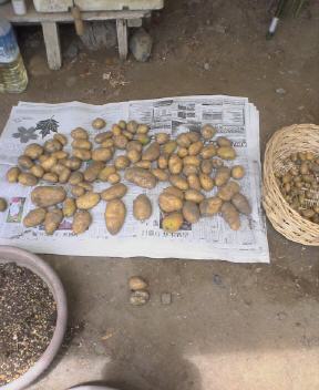 新じゃがの収穫です。初めてにしては上出来ではないですか。なにせ、芽が出てしまった捨てるしかなかったジャガイモを適当に切って植えただけでこれだけの収穫ができたのです。いいかげんなものです。肥料もやらなかったし、土よせなどもやらなかった、というのか知らなかった。こんなもんで元の十倍以上になって戻ってくるわけだから、植物の力というのか生命力というのは凄いものだ。
