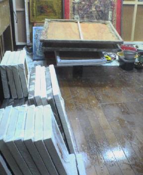 私の作品はキャンバスに描かれたものではない。よく誤解されるのだが、油彩画ではないのだ。日本画のようにパネルに綿布や麻布を直接水張りしたものを使う。これが又数が多いので、けっこうな作業ではあるのだな。やる時には一度に50枚ぐらいの水張りをする。